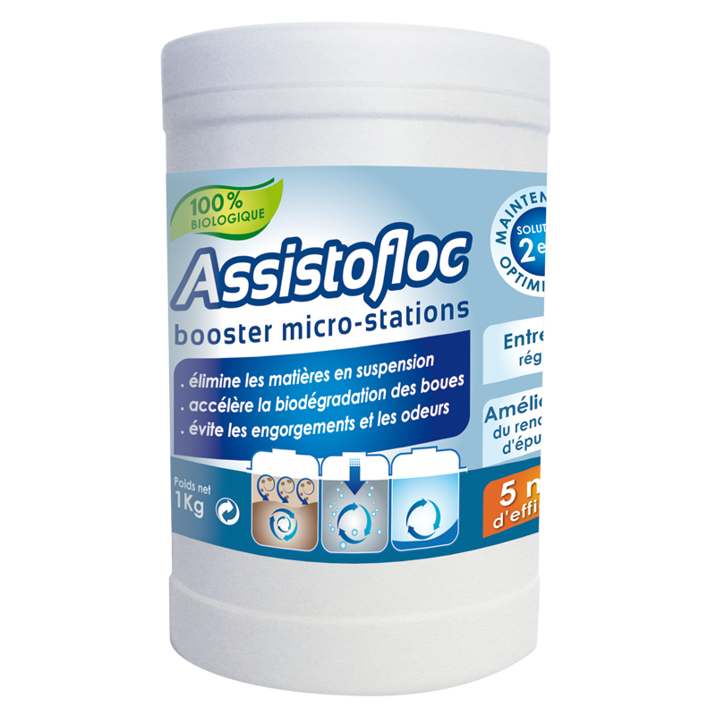 ASSISTOFLOC améliore, dans le bassin d’aération, la formation des flocs bactériens responsables de l’épuration des eaux. Ces flocs sont plus facilement séparés des eaux traitées dans le clarificateur, et restent ainsi dans la microstation, ce qui maximalise la quantité de bactéries dans la microstation.