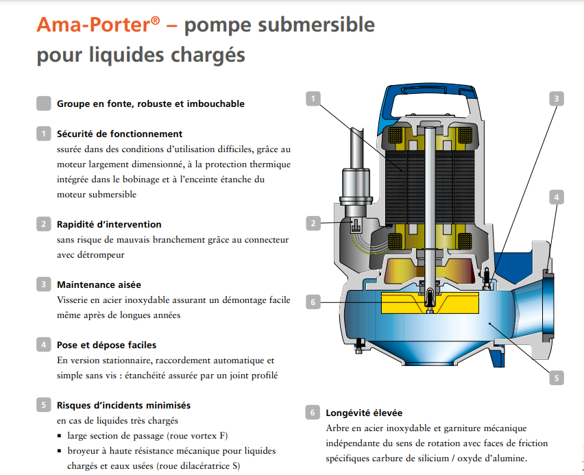 - Fiabilité : Elle est capable de traiter des solides de taille allant jusqu'à 45 mm, ce qui garantit une évacuation fiable des eaux chargées.
