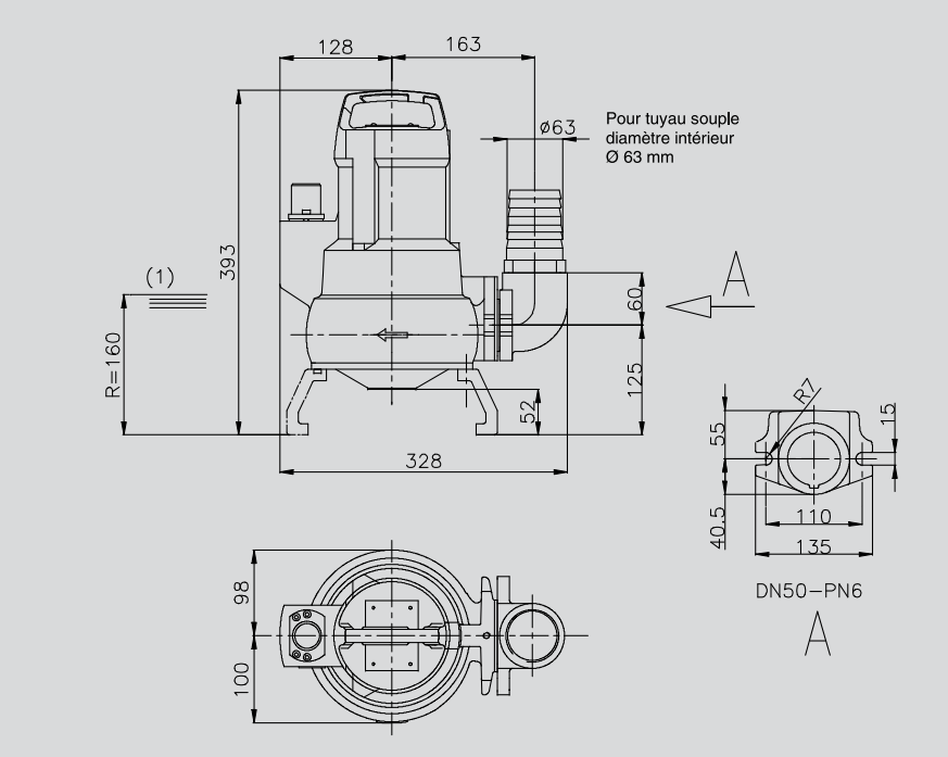 Pompe de relevage submersible monobloc avec roue vortex pour eaux grises et eaux noires. Construction robuste en fonte. Applications :
